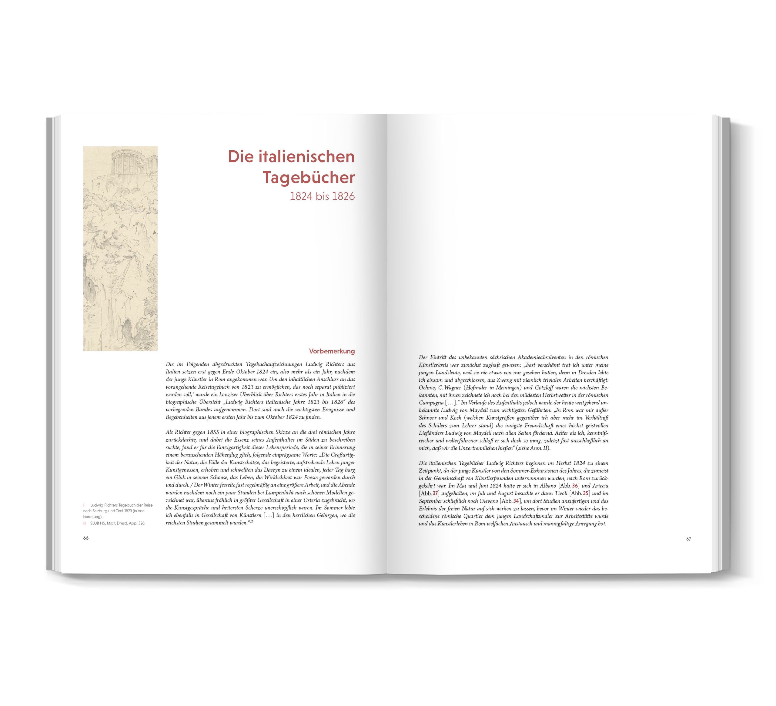 Ludwig Richter’s diaries from his stay in Italy from 1823 to 1826 have never before been published in their entirety. This edition is based on a precise transcription of the artist’s handwritten notes, supplemented with detailed commentary. These authentic sources provide extensive insight into Richter’s artistic views and plans at that time, and they fully illuminate the painter’s later transition to illustration and printmaking in all its decisive significance. Furthermore, Richter’s personal notes convey a multifaceted picture of artistic life in Rome during that period. In contrast to the artist’s widely read memoirs, this volume presents contemporary accounts that correspond to the actual facts and are thus entirely credible, allowing for a reliable assessment of the young artist’s development during his early years. Richter’s later memoirs, on the other hand, are a deliberately literary self-portrayal intended for posterity, in which certain details were intentionally altered because the artist sought to convey general ethical and moral lessons through the description of his own life story. In any case, the diaries are of inestimable importance as a reliable source for reconstructing the course of his life. Richter himself used them as working material for writing his life story.
